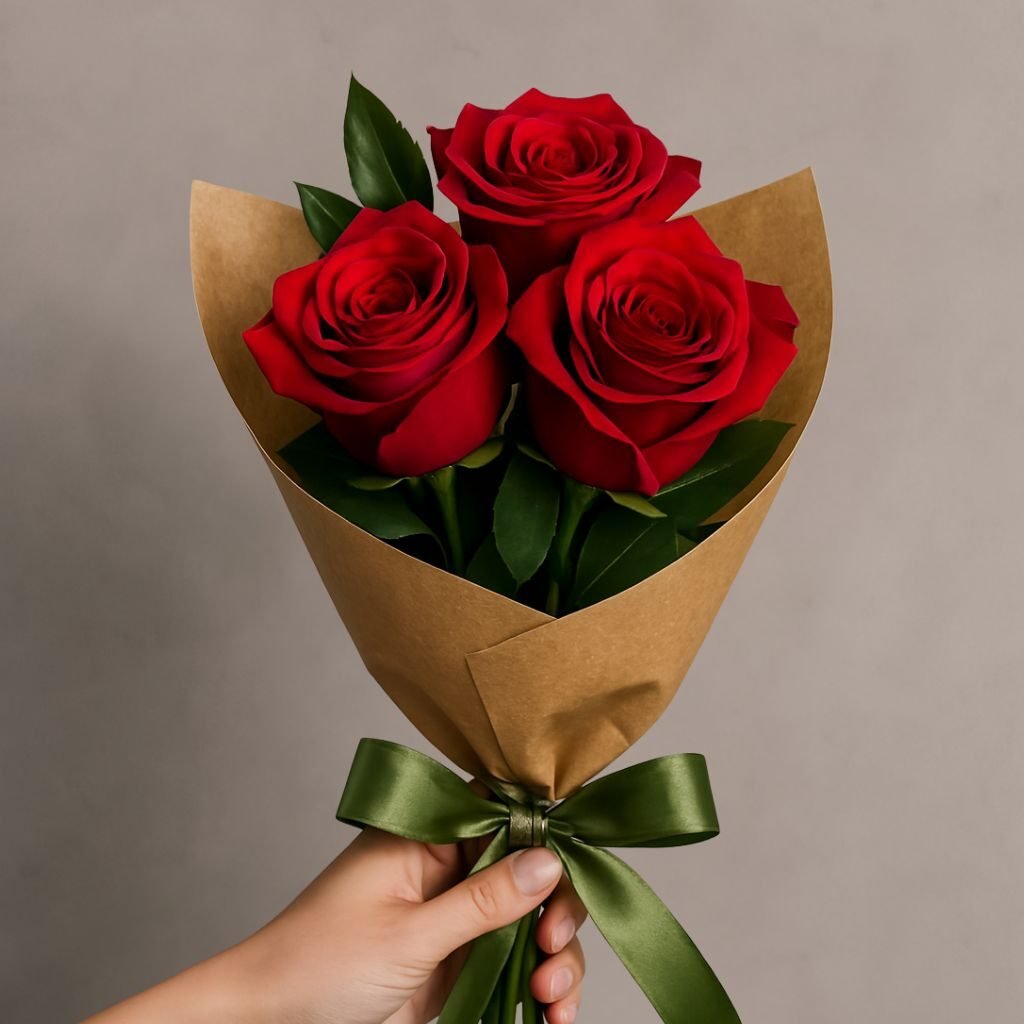 Buquê com 3 rosas vermelhas, envoltas em folhagens frescas e embalagem especial.